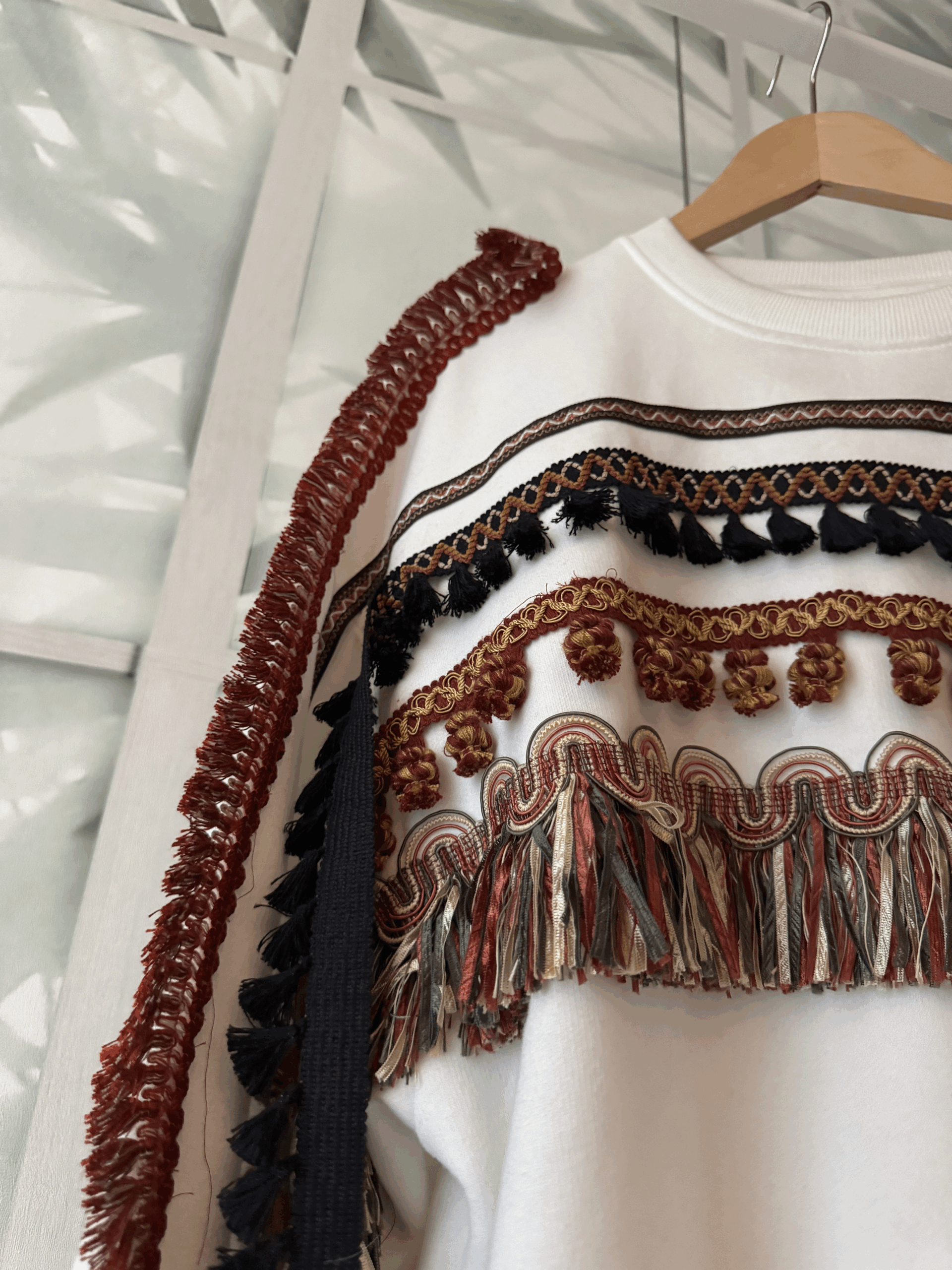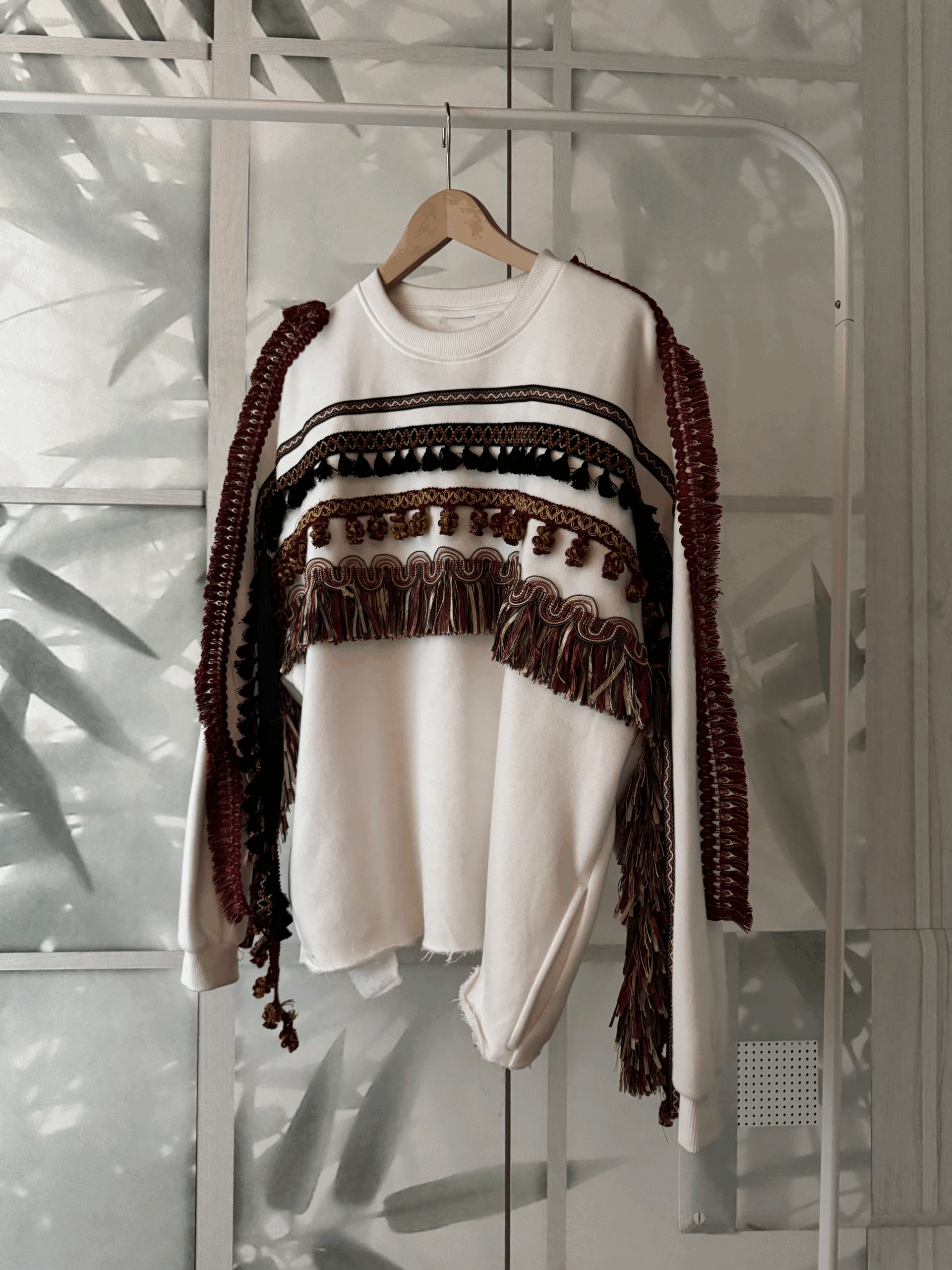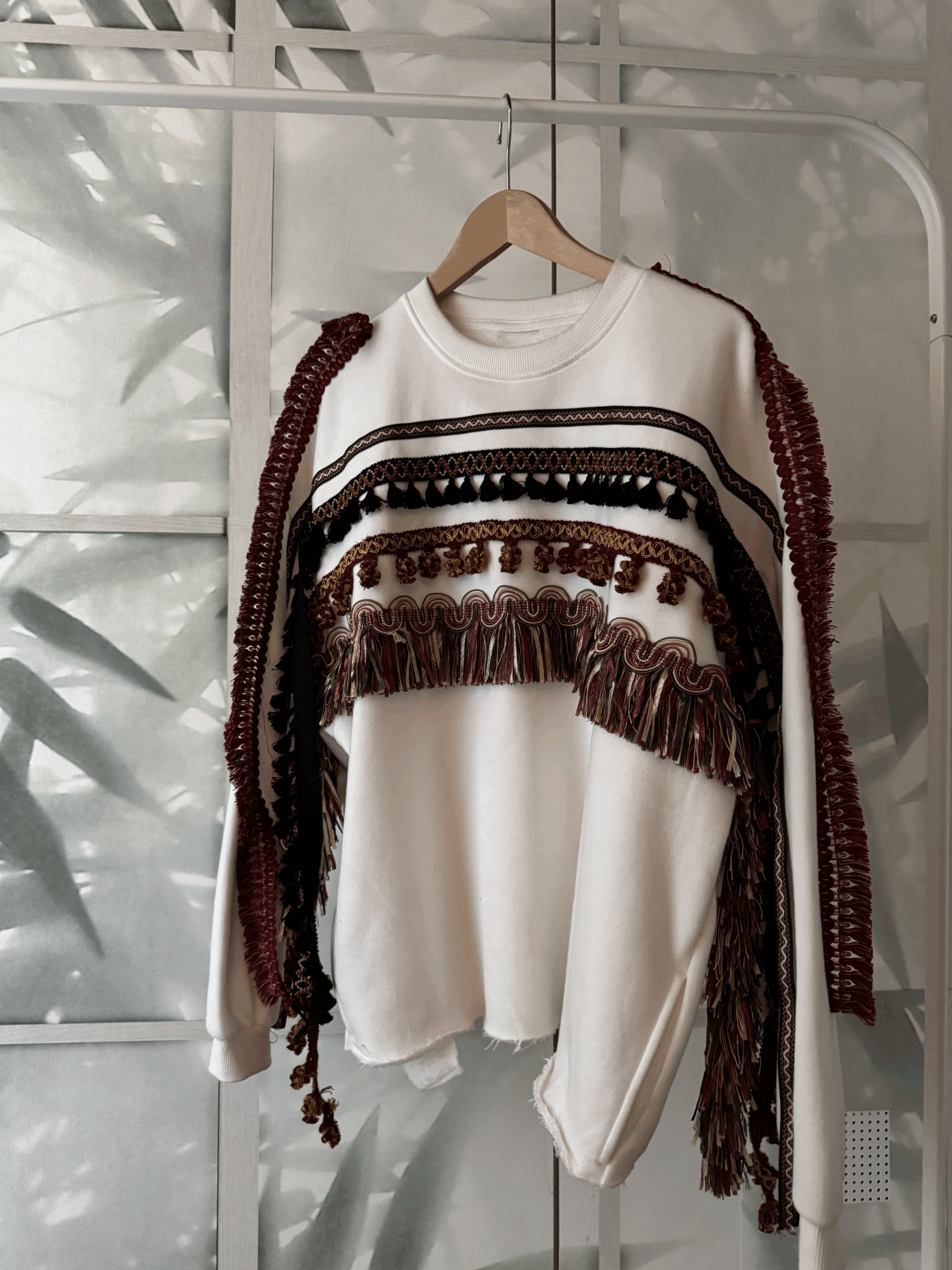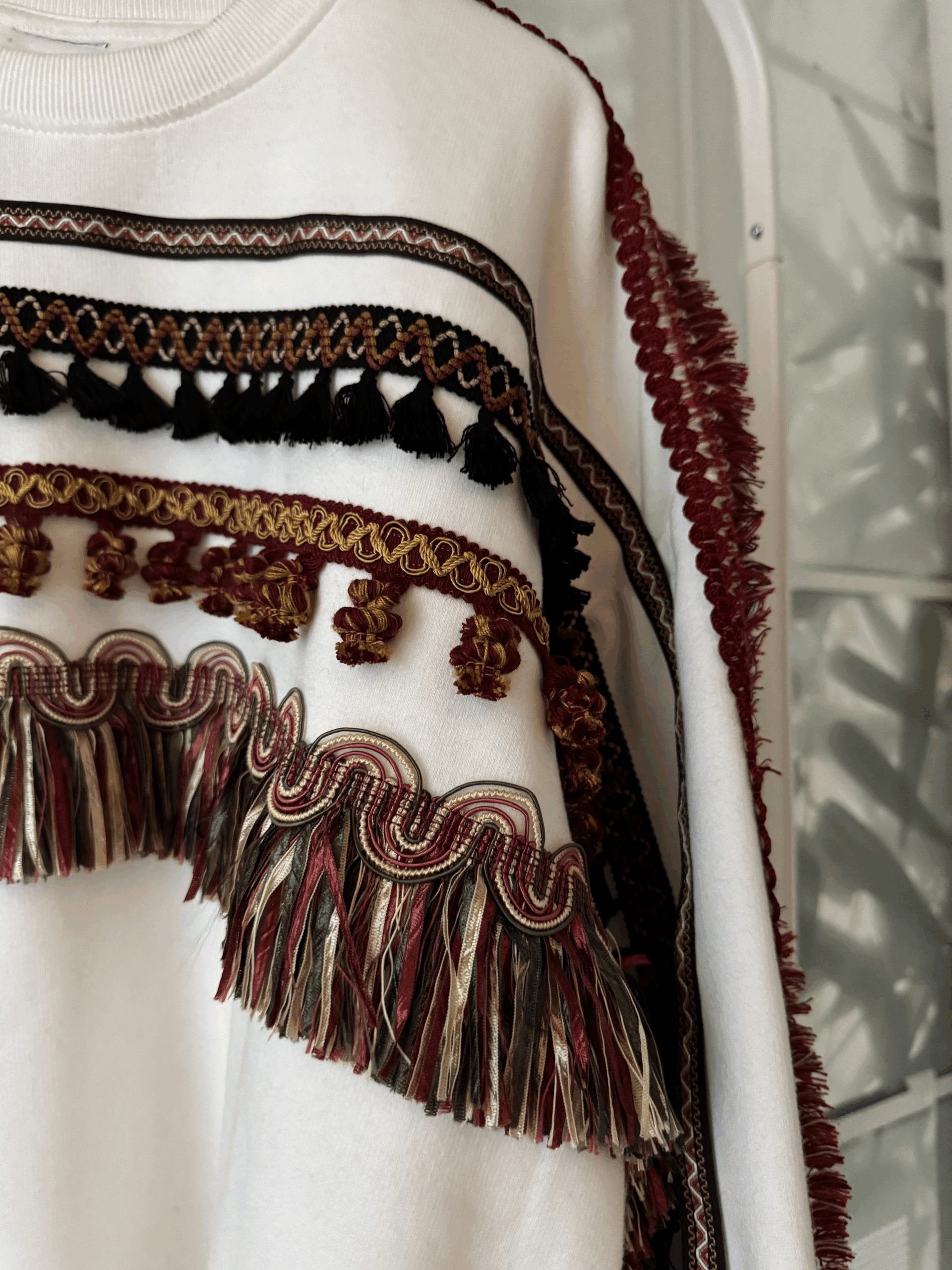 Felpa unisex a girocollo in bianco caldo (off-white) con vestibilità relaxed e spalle leggermente scese. Il fronte è ricco di passamanerie: bande jacquard in nero, bronzo e bordeaux con piccole nappe nere e motivi ricamati ondulati; sotto corre una grande frangia multicolor (bordeaux, verde oliva, oro) che attraversa il petto e scende sui lati. Lungo l’esterno delle maniche corre una fascia lavorata bordeaux a rilievo, mentre sui fianchi pendono frange e trecce decor. Finiture: collo e polsini a costine tono su tono, orlo effetto taglio vivo leggermente irregolare per un tocco artigianale. Realizzata con cotone e poliestere riciclati certificati RCS: stile deciso, meno sprechi, più durata.