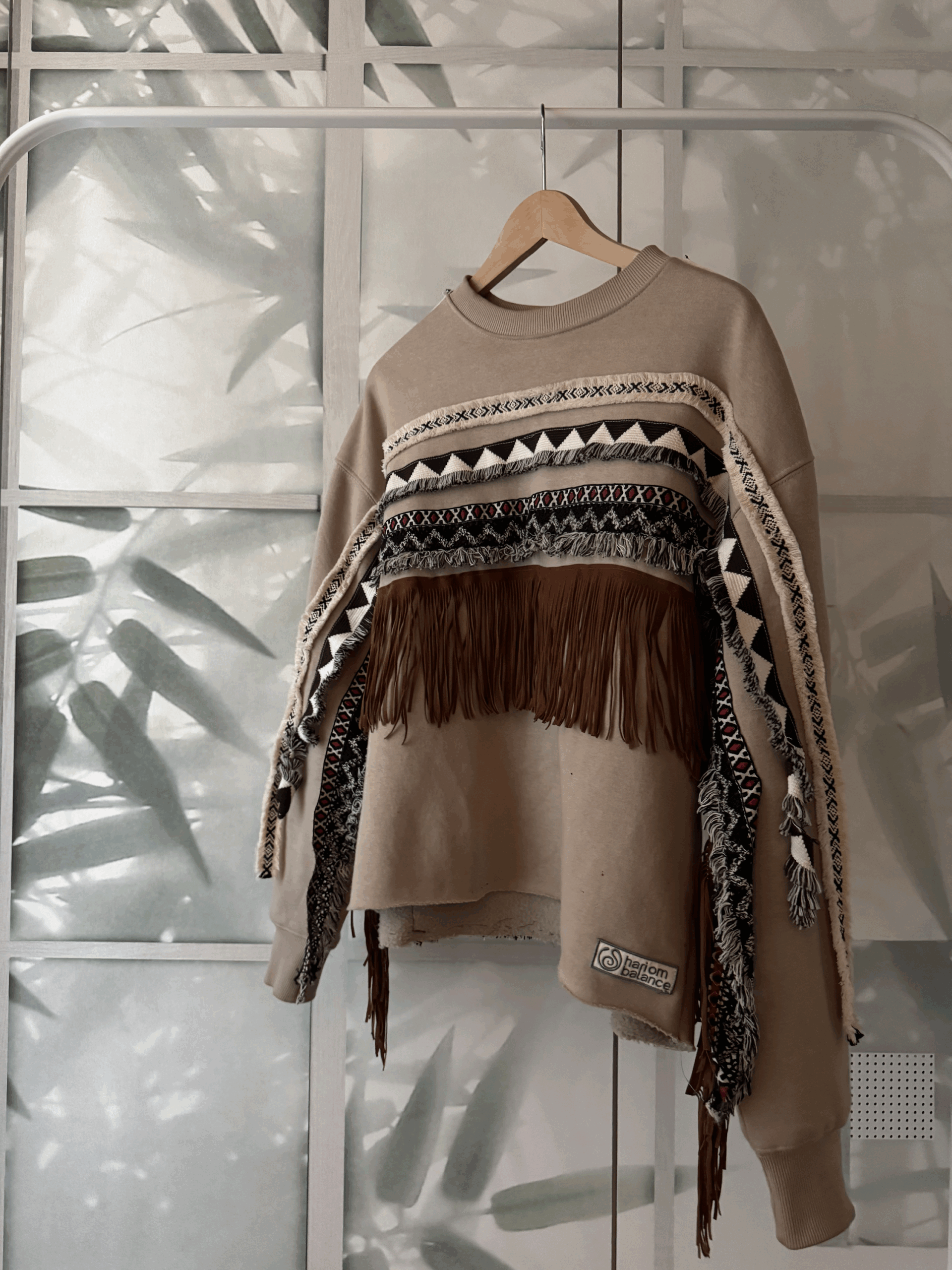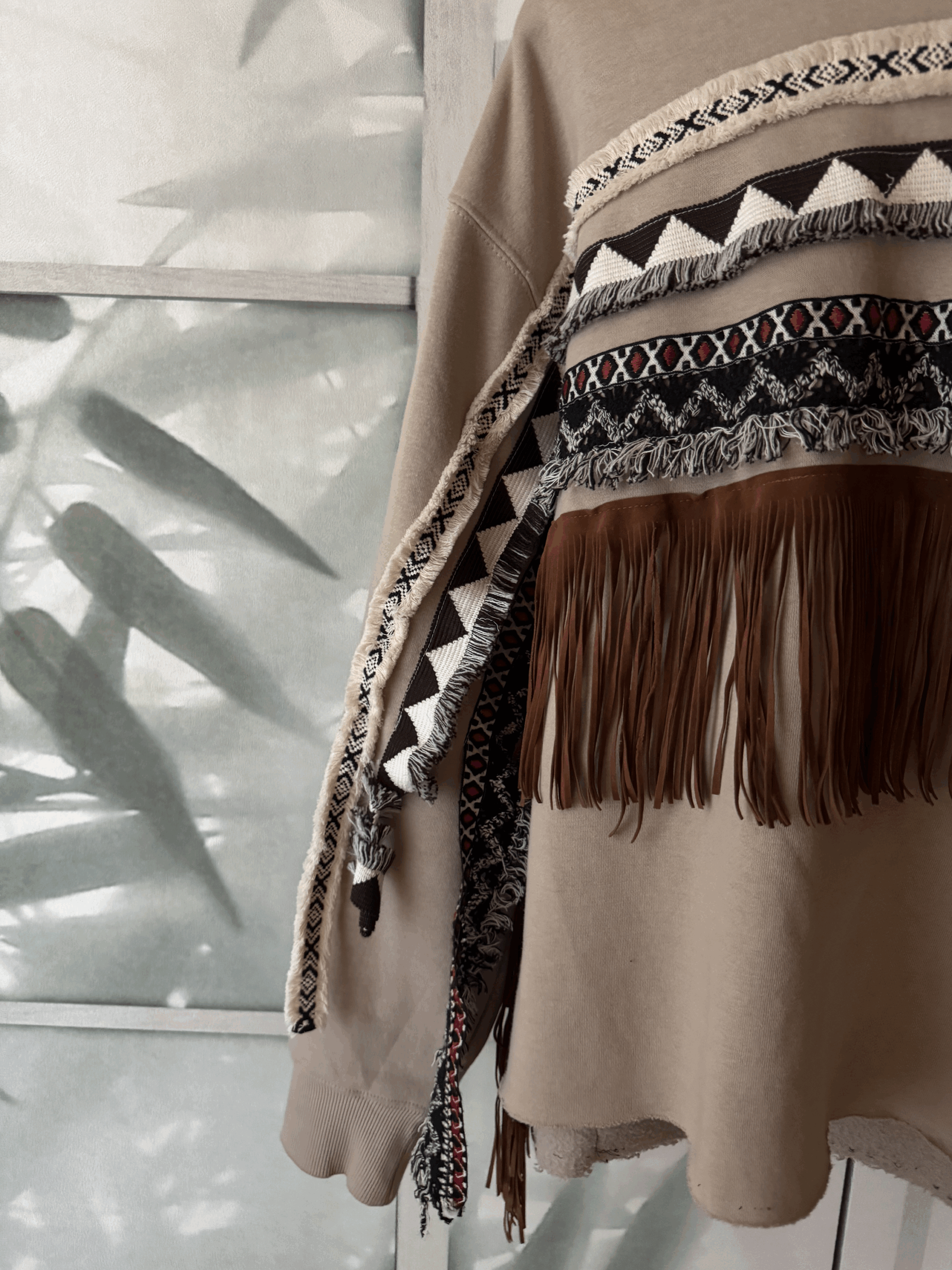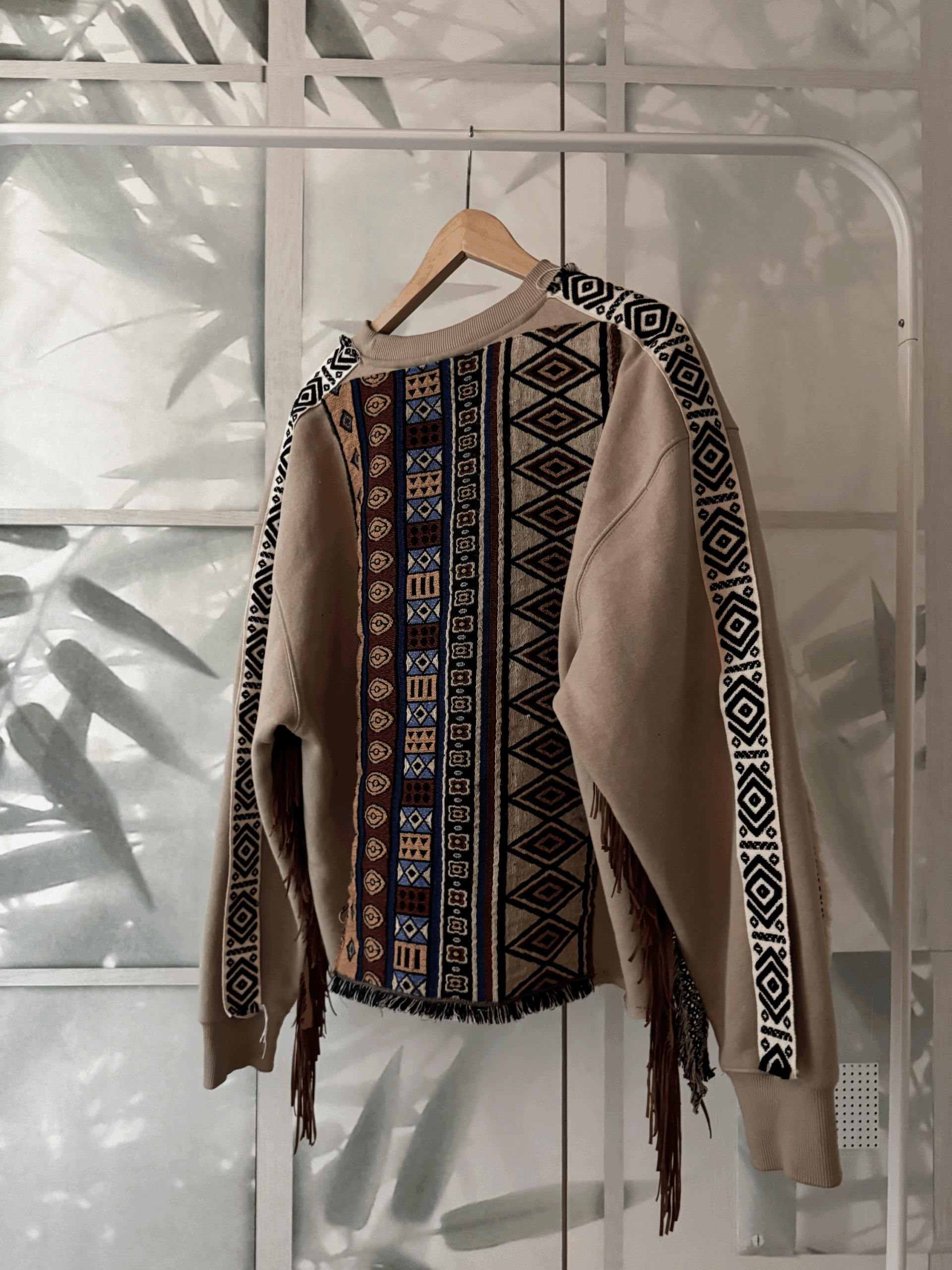 Felpa unisex a girocollo beige sabbia dalla vestibilità relaxed. Il look è boho–artigianale: davanti fasce jacquard geometriche con piccole frange color cuoio, sui fianchi trecce e nappe. Sul retro spicca un pannello jacquard verticale multicolor (ocra, blu, rosso, avorio) con bordo sfrangiato che continua su spalle e maniche. Collo e polsi a costine, orlo con leggero effetto taglio vivo. Realizzata con cotone e poliestere riciclati certificati RCS: stile deciso, meno sprechi, più durata.
