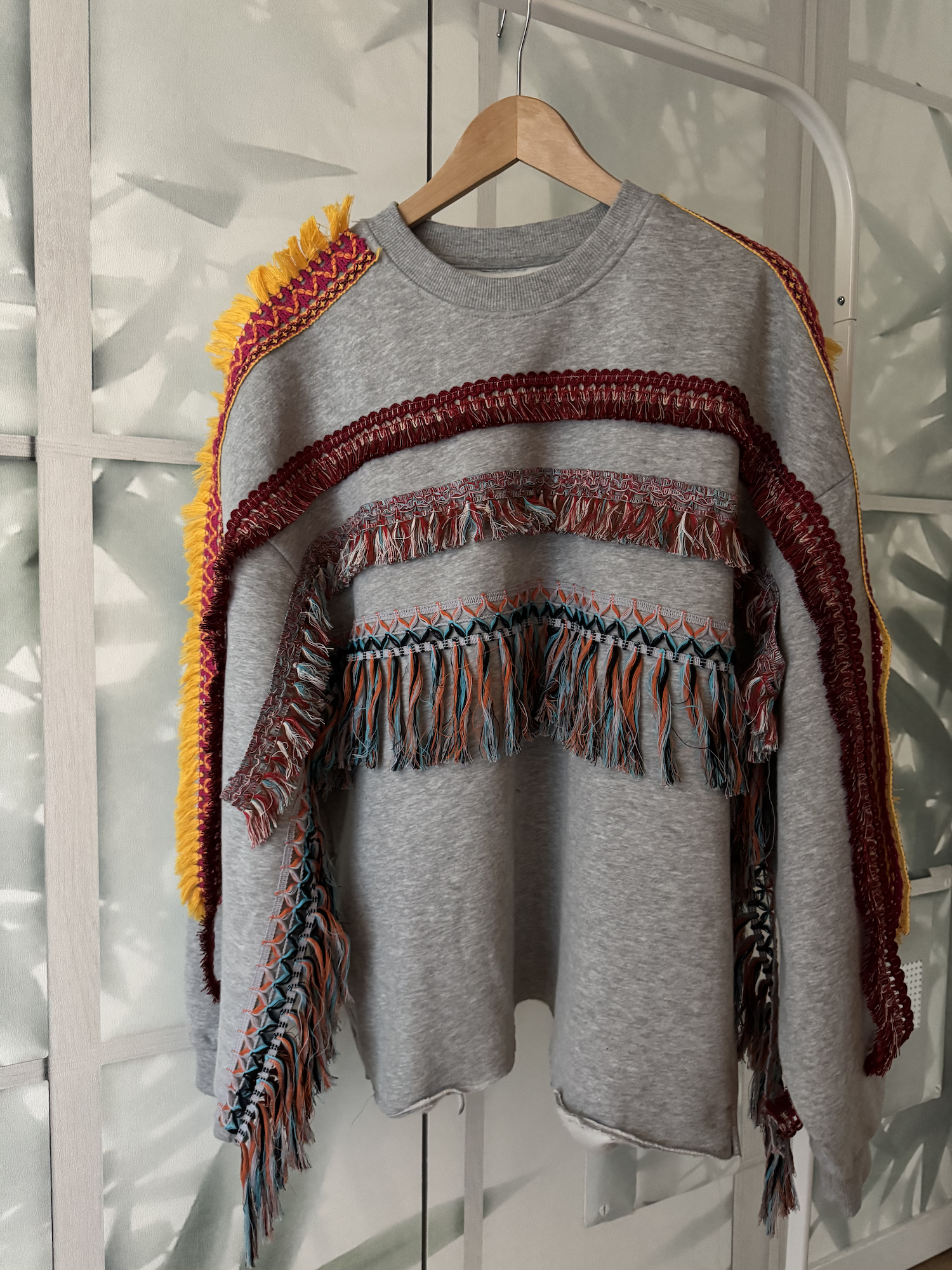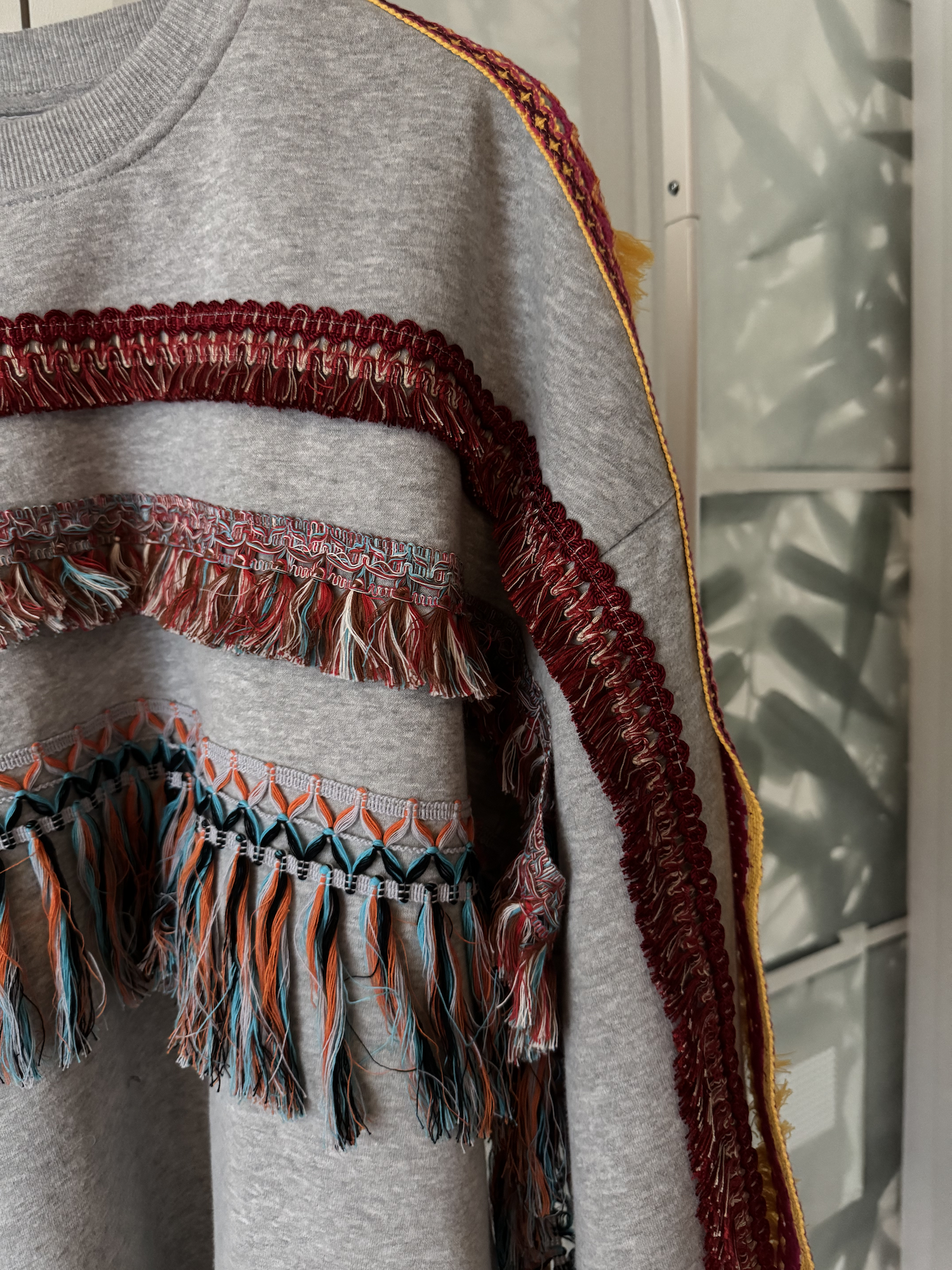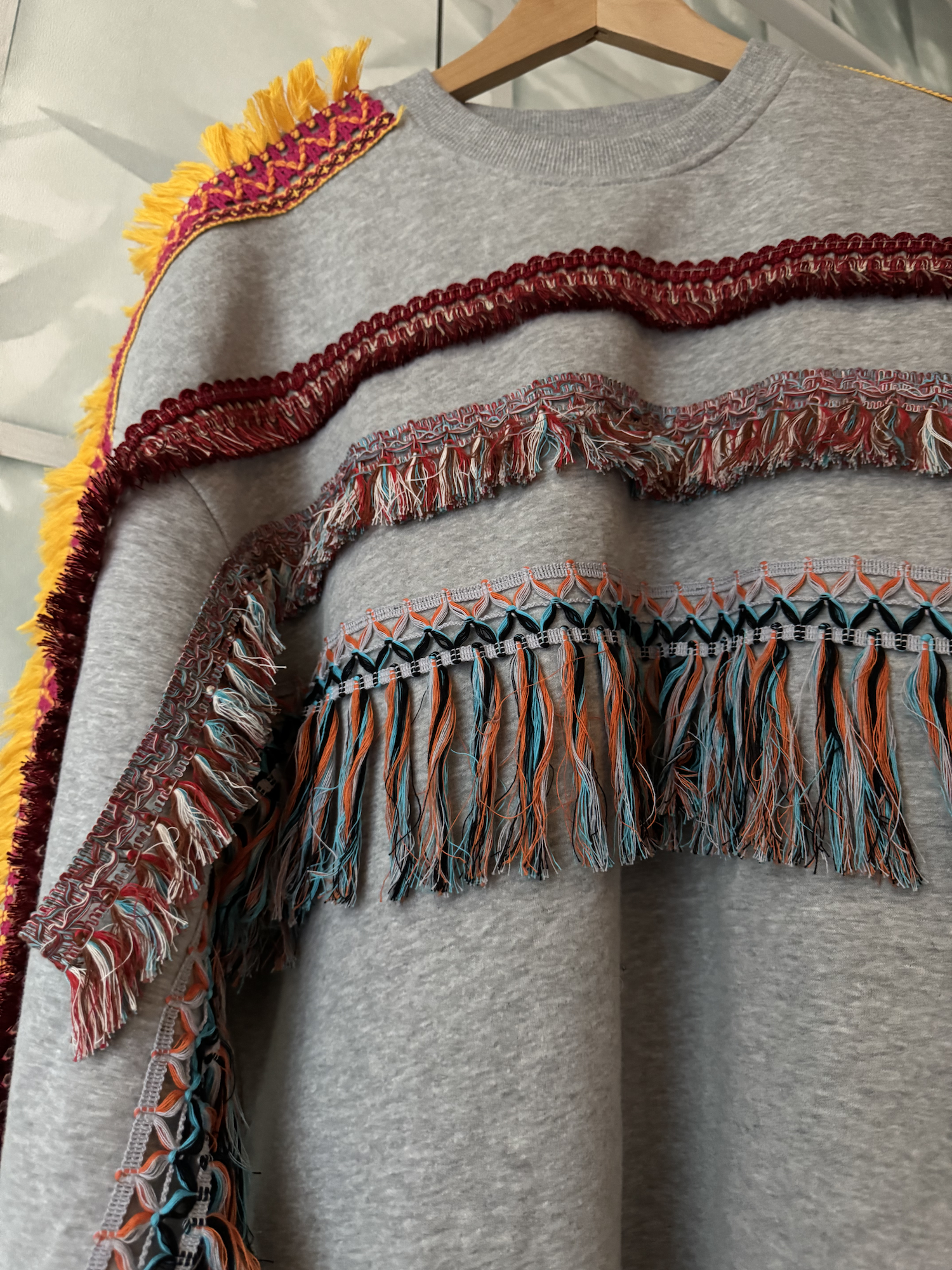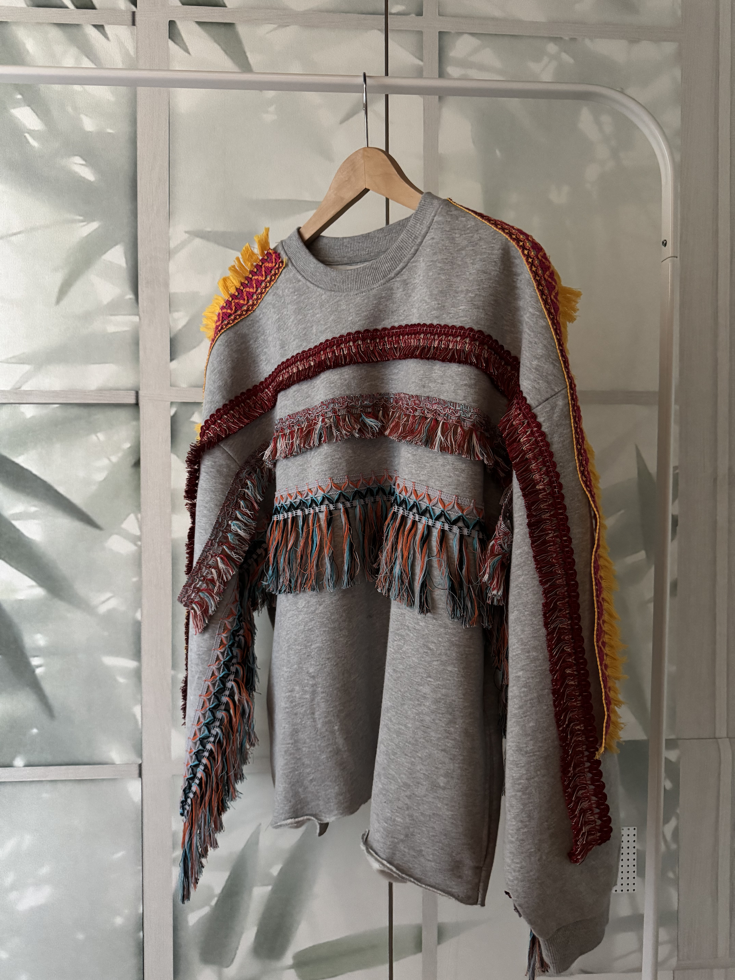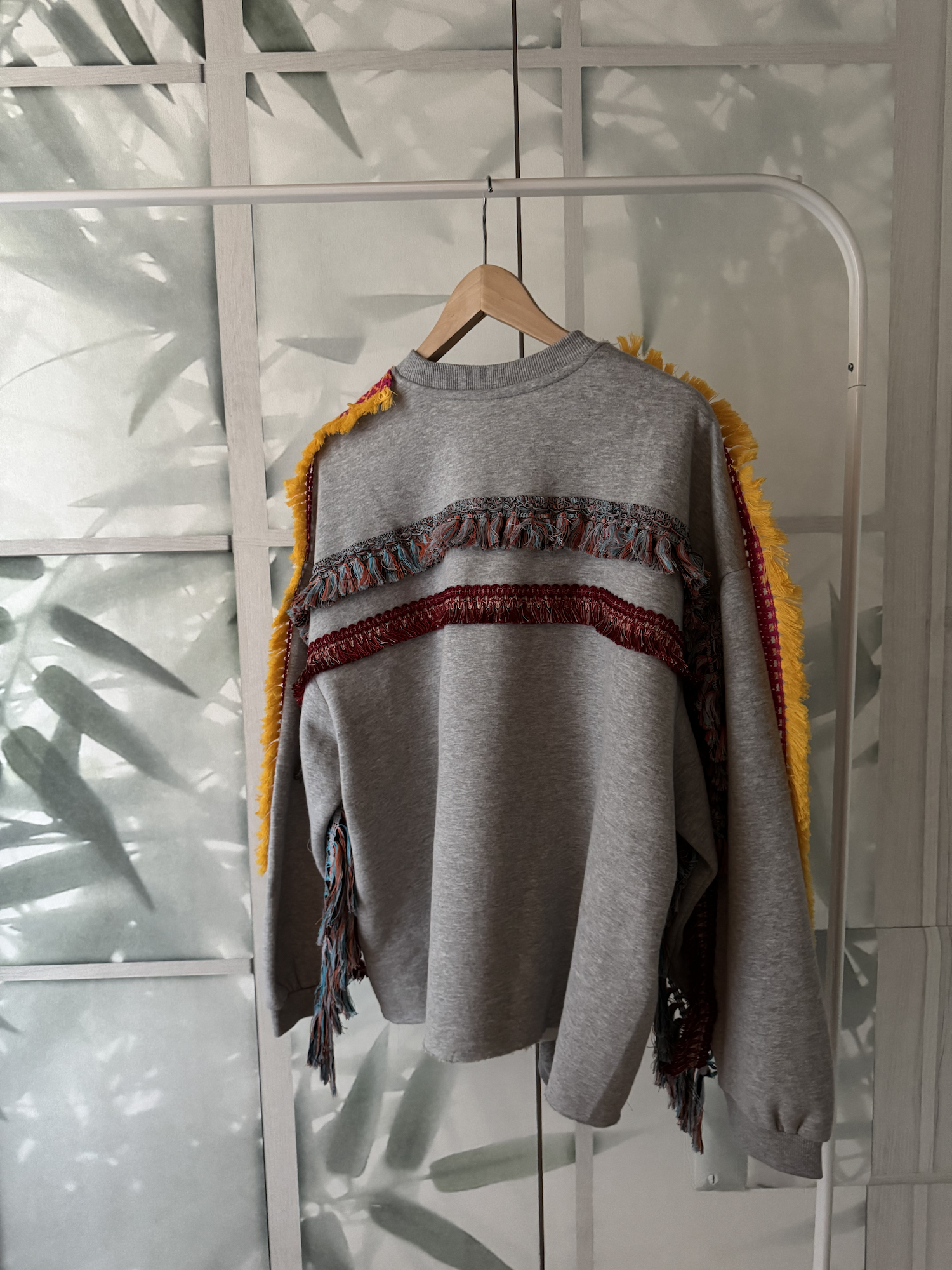 Felpa unisex a girocollo in grigio mélange con vestibilità relaxed e spalle leggermente scese. Il fronte è ricco di passamanerie: fasce jacquard in bordeaux/rosso rubino intervallate da frange multicolor (turchese, arancio, ruggine) che attraversano il petto e scendono sui lati; lungo le maniche corrono intrecci decorativi con frange più lunghe a contrasto. Le spalle sono evidenziate da un bordo ricamato con frange giallo sole e dettagli fucsia/arancio che aggiungono movimento. Il retro è più essenziale: una fascia ricamata orizzontale con piccole frange nella parte alta, mentre il resto resta pulito, con le frange laterali che rimangono visibili sul fondo. Finiture: collo e polsini a costine tono su tono, orlo effetto taglio vivo leggermente irregolare per un tocco artigianale. Realizzata con cotone e poliestere riciclati certificati RCS: stile deciso, meno sprechi, più durata.
