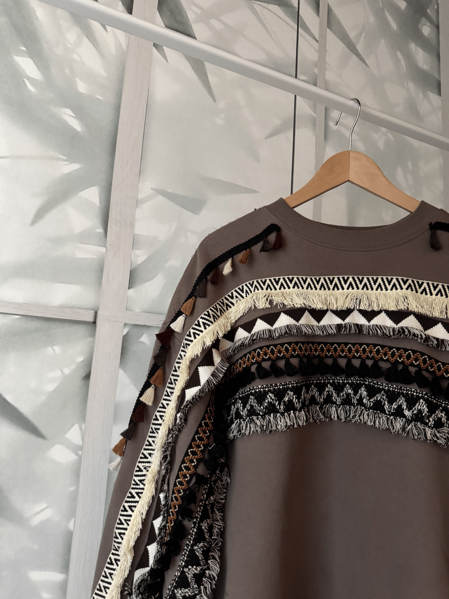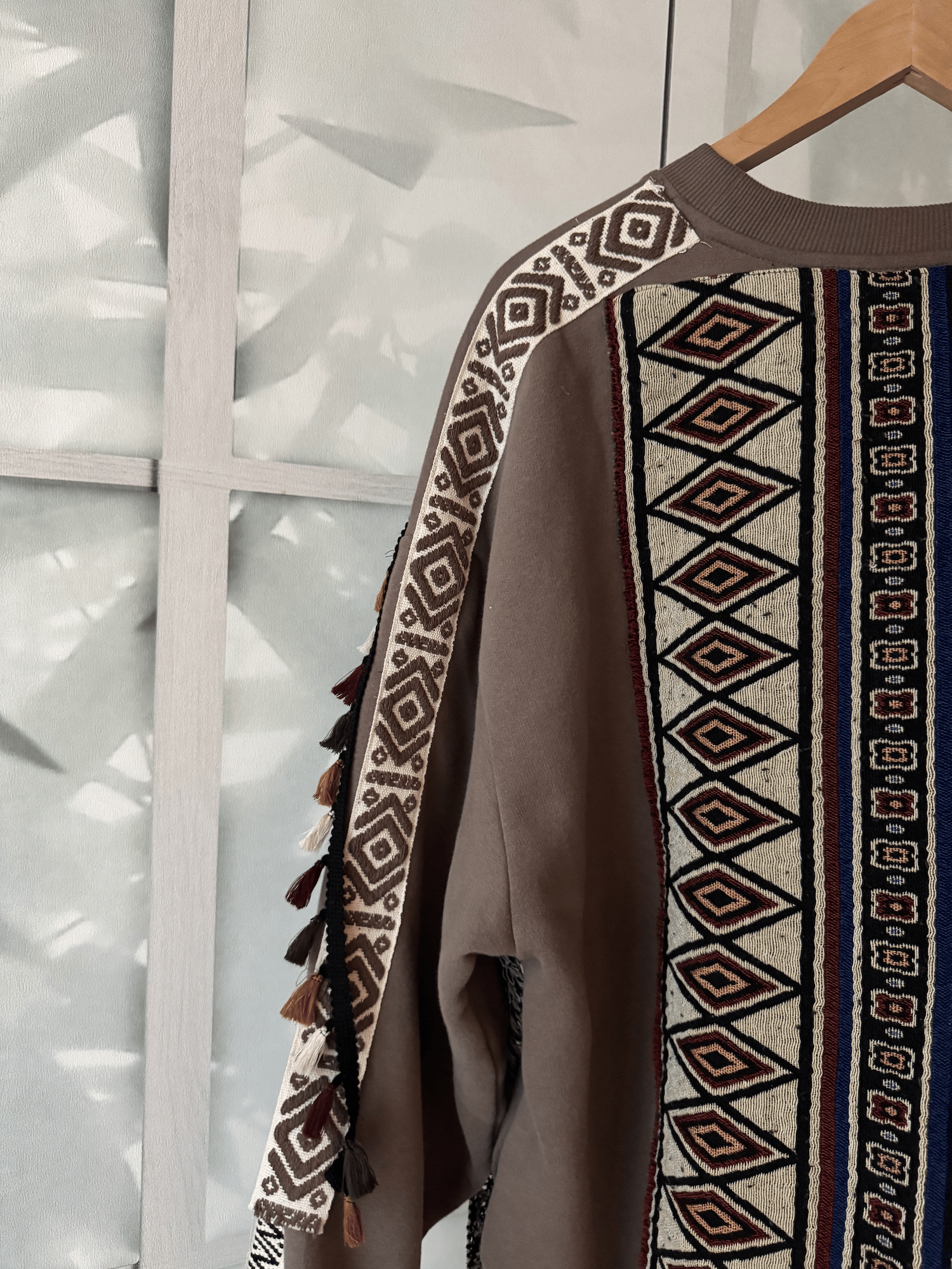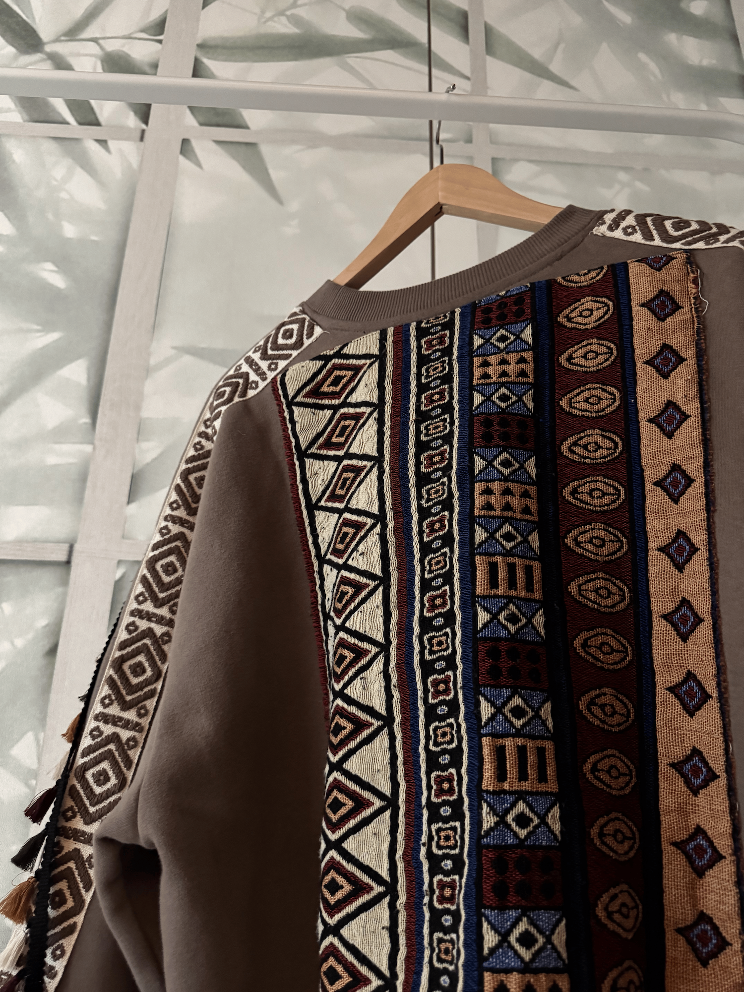 Felpa unisex a girocollo in taupe con vestibilità relaxed e spalle leggermente scese. Il fronte è decorato da fasce jacquard geometriche in avorio e nero con inserti bruno/caramello; compaiono piccole nappe applicate sulle spalle e lungo le bande laterali, frange corte avorio e dettagli intrecciati neri che danno movimento. Lungo le maniche scorrono nastri lavorati con motivi a rombi che terminano in frange sfrangiate. Il retro ospita un ampio pannello jacquard verticale multicolor (avorio, cammello, bordeaux, blu/indaco e nero) bordato da profili sfrangiati che proseguono su spalle e maniche. Finiture: collo e polsini a costine tono su tono, orlo effetto taglio vivo leggermente irregolare.