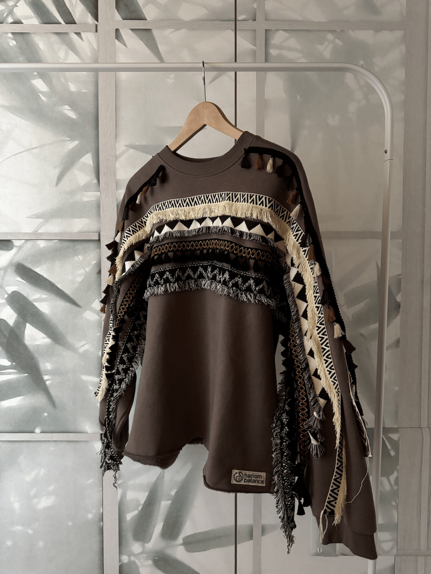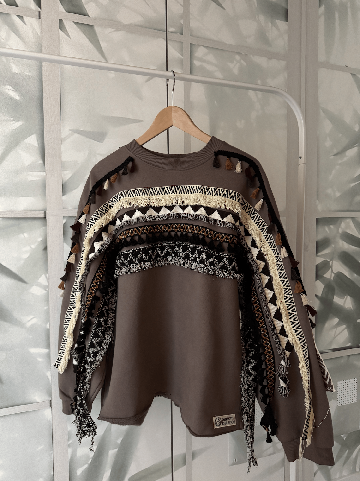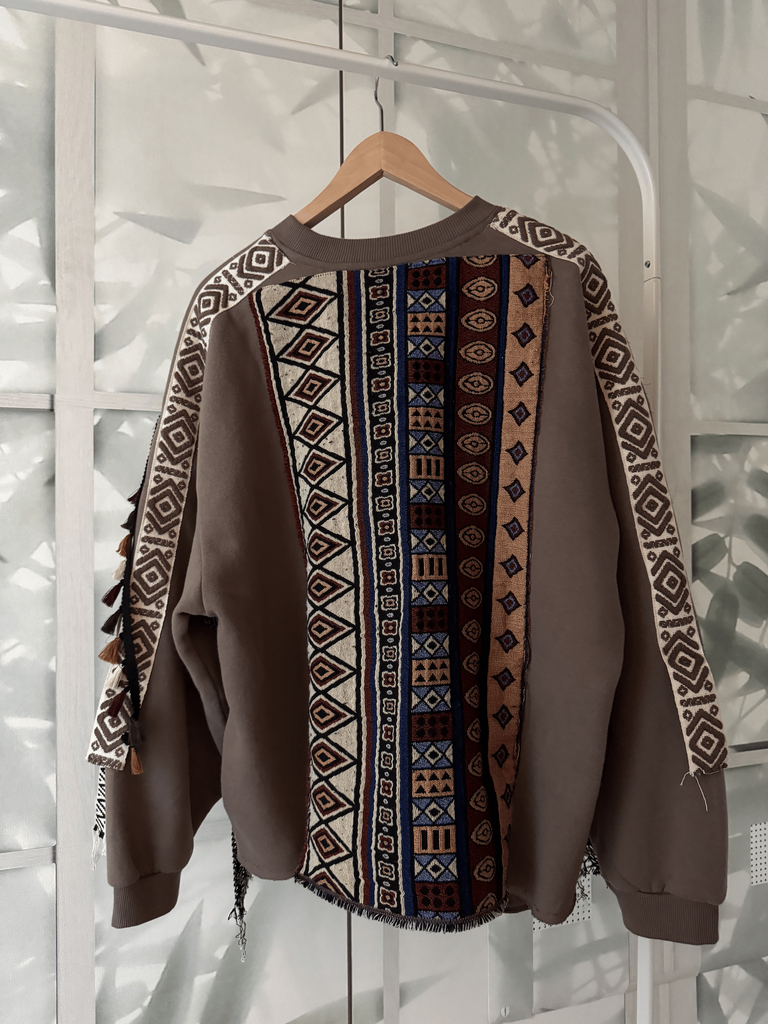 Felpa unisex a girocollo in taupe con vestibilità relaxed e spalle leggermente scese. Il fronte è decorato da fasce jacquard geometriche in avorio e nero con inserti bruno/caramello; compaiono piccole nappe applicate sulle spalle e lungo le bande laterali, frange corte avorio e dettagli intrecciati neri che danno movimento. Lungo le maniche scorrono nastri lavorati con motivi a rombi che terminano in frange sfrangiate. Il retro ospita un ampio pannello jacquard verticale multicolor (avorio, cammello, bordeaux, blu/indaco e nero) bordato da profili sfrangiati che proseguono su spalle e maniche. Finiture: collo e polsini a costine tono su tono, orlo effetto taglio vivo leggermente irregolare.